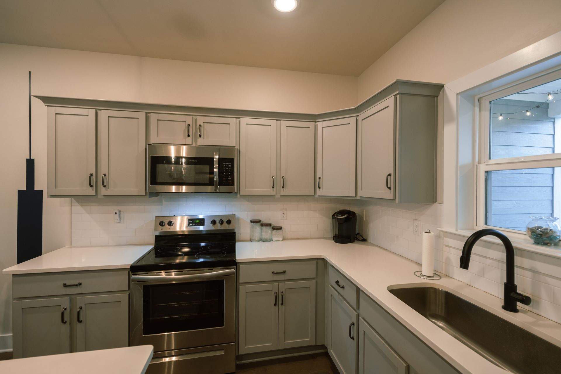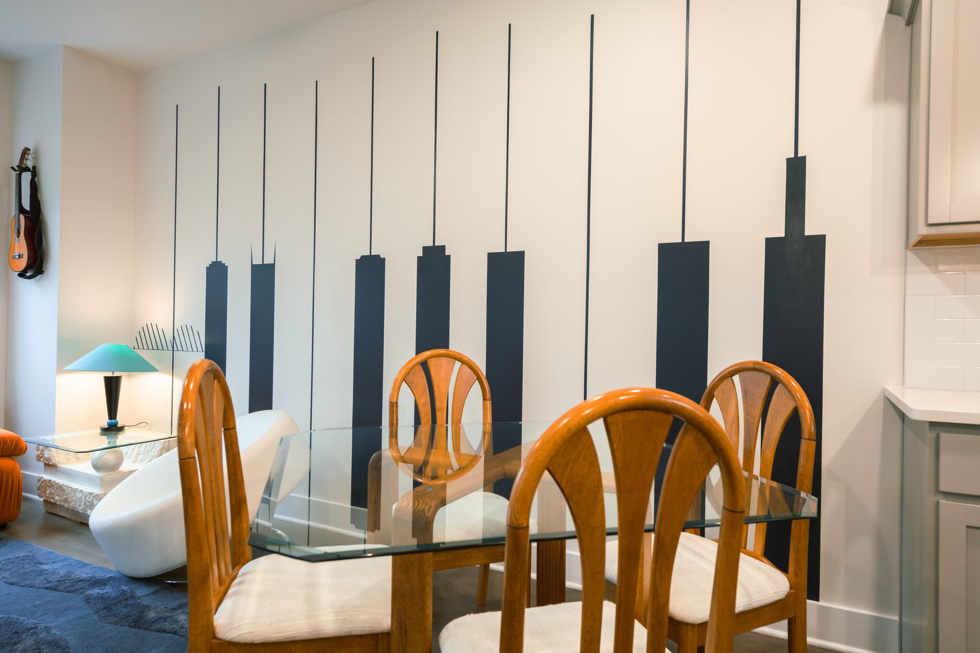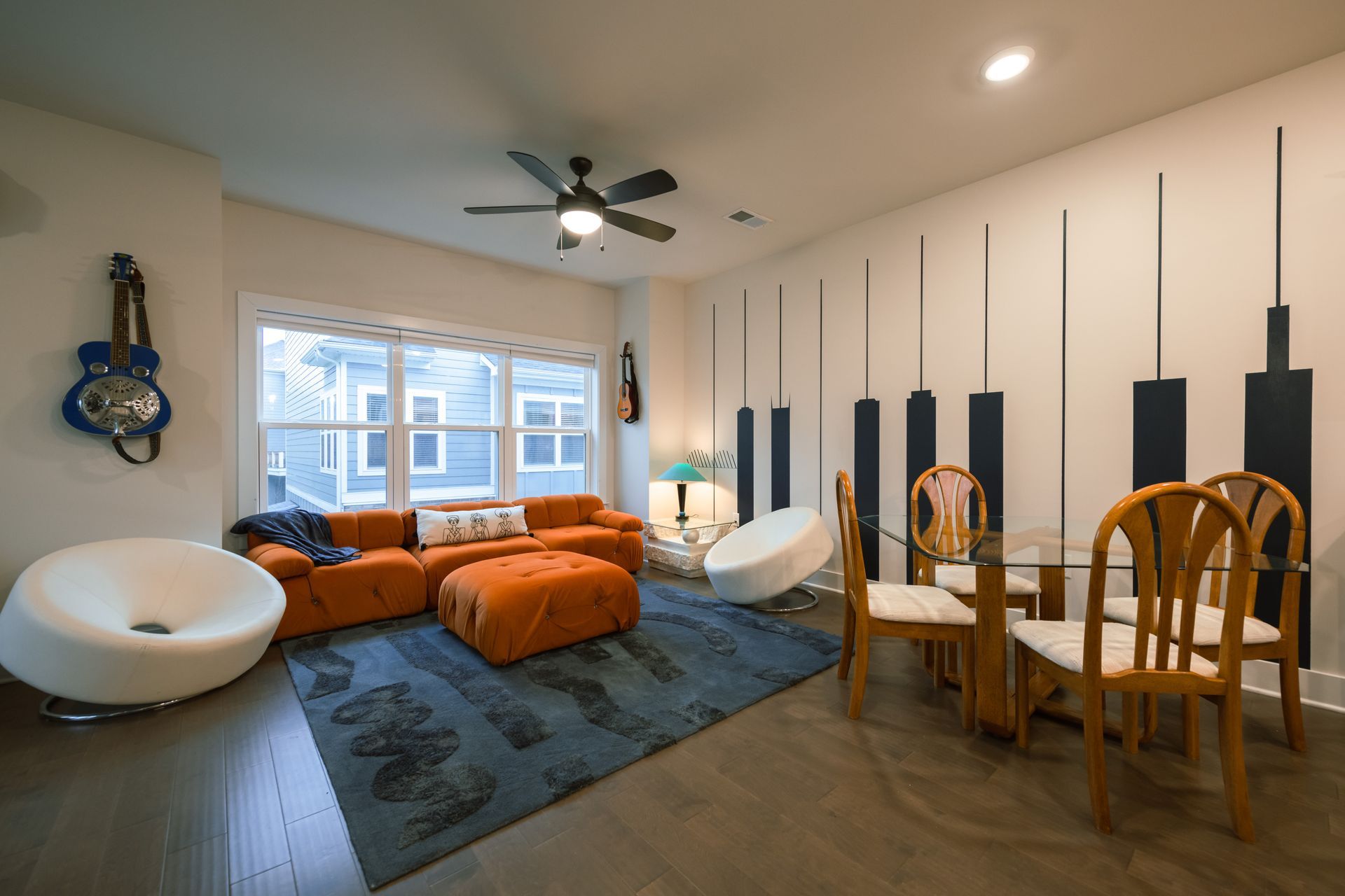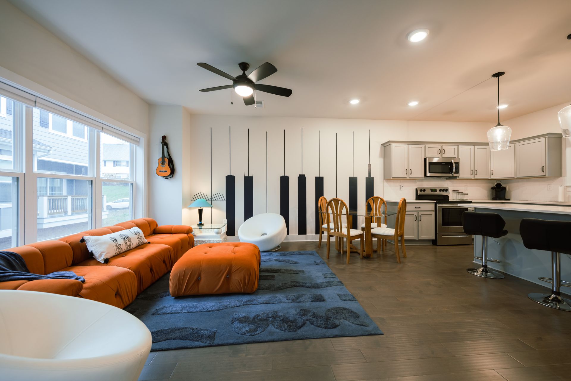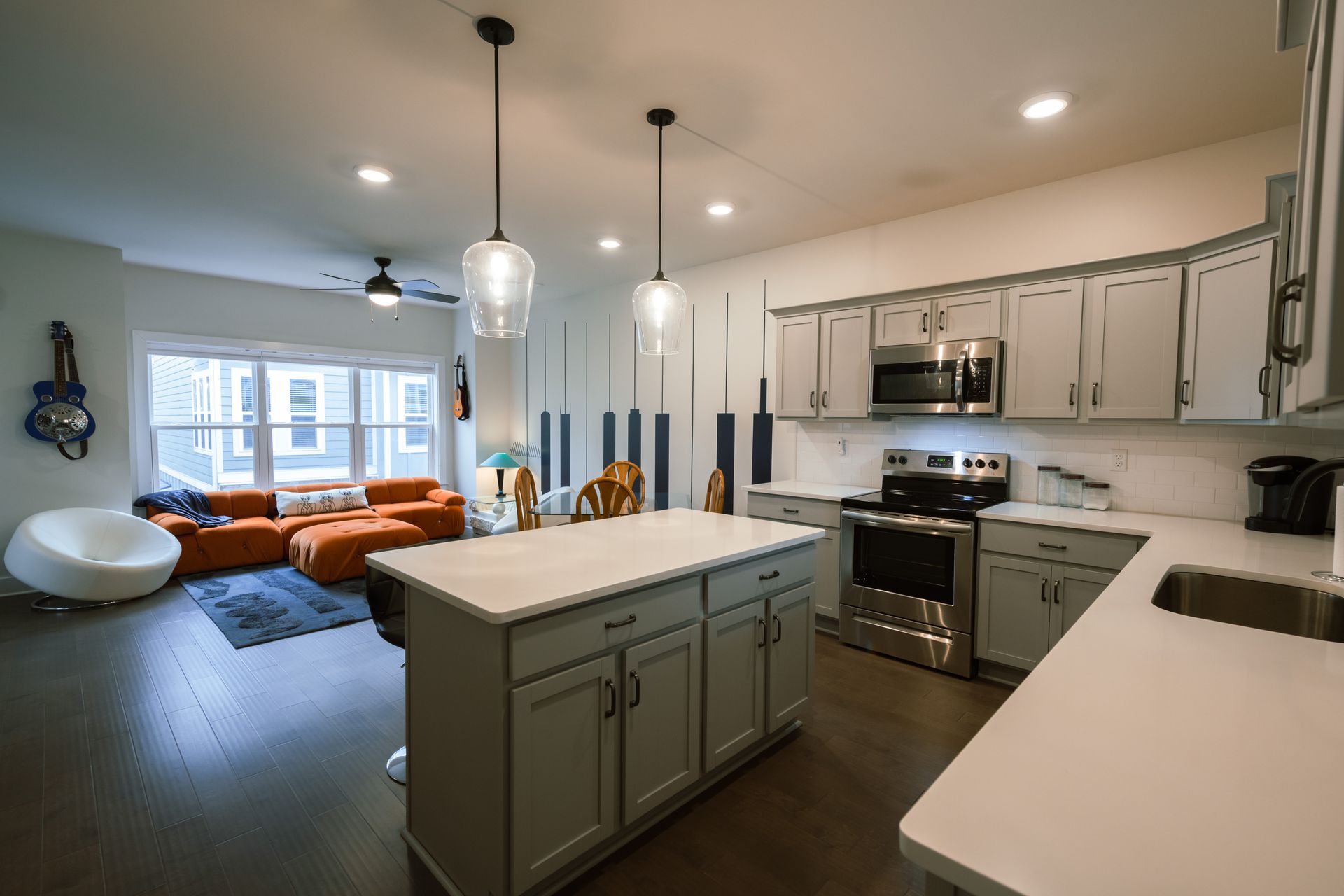 Boasting an open floor plan, the beautifully equipped kitchen, inviting dining room, and cozy living room blend together seamlessly. After an exhilarating day of exploring the city, sink into the plush sofas in the living room and unwind in front of the 55" Roku TV.